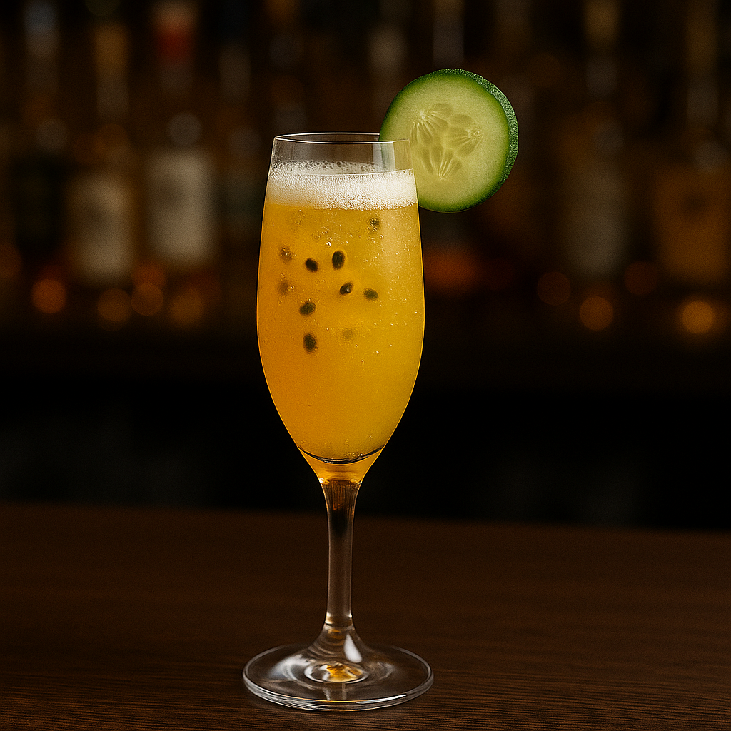 Pisco reservado transparente / Syrup simple / Pepino / Pulpa de maracuyá / Espumante